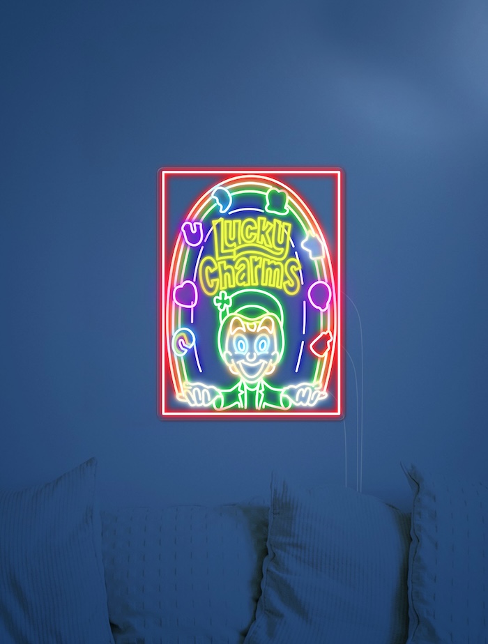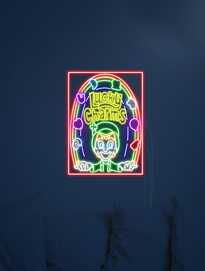 Bring a touch of magic to your kitchen or café with this Lucky Charms neon sign featuring the cute leprechaun mascot, Lucky. A fun décor piece forbreakfast nook, restaurants, or cafés.